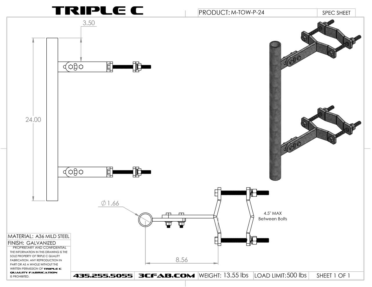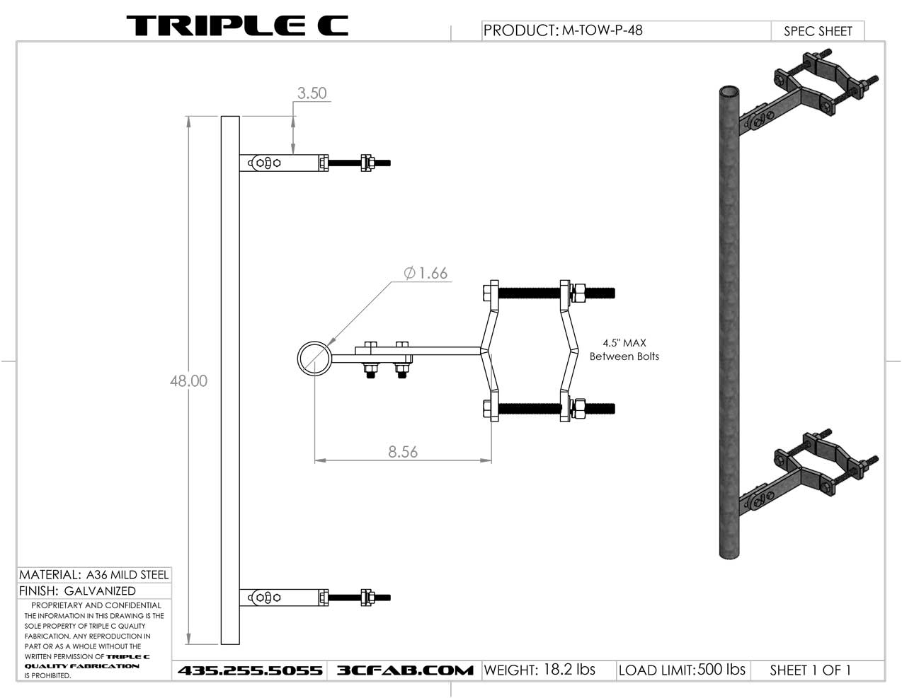Mount pipe is 1.66” outer diameter. Provides a 8.5” minimum standoff.